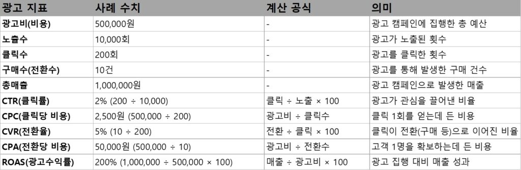 광고 성과 지표 정리 (CTR, CPC, CVR, CPA, ROAS 포함)