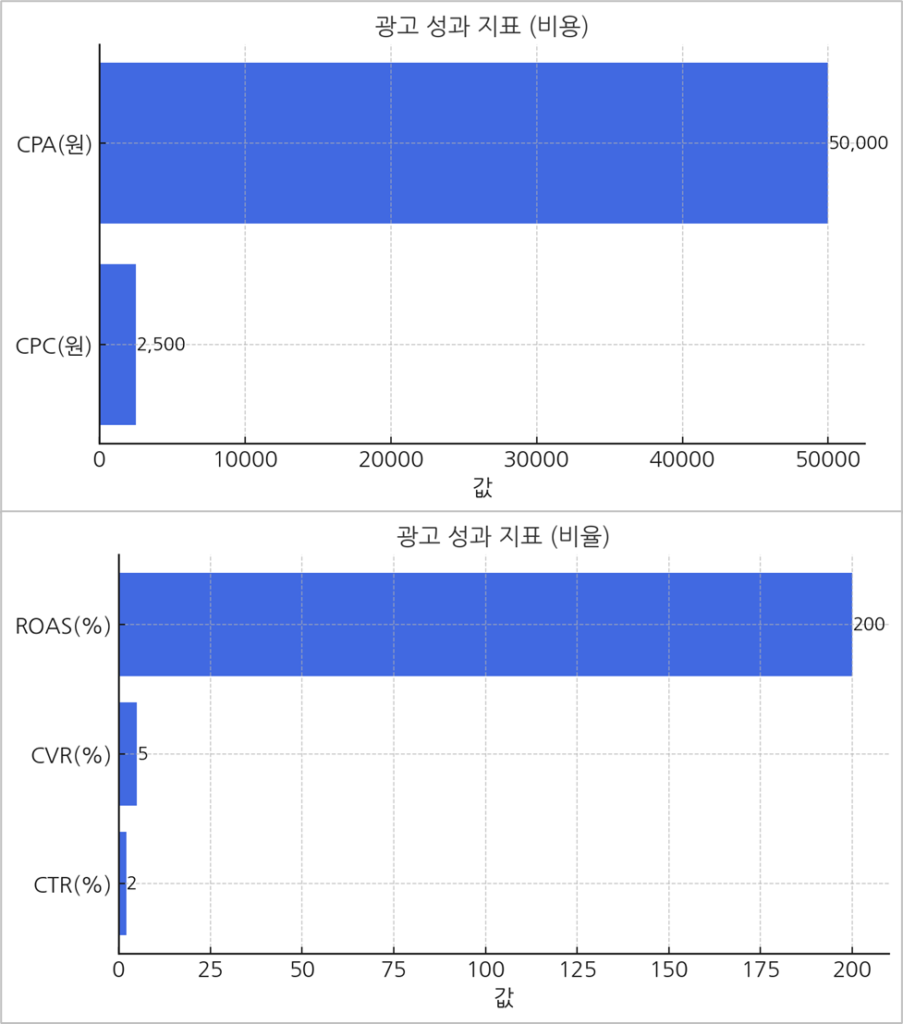 - CPC: 예산 500,000 ÷ 클릭 200 = 2,500원